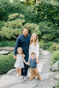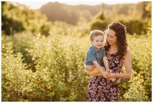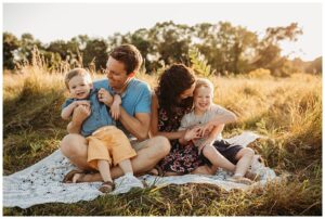 A bride and groom share a tender moment outdoors, captured in warm sunlight.