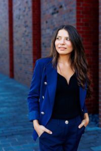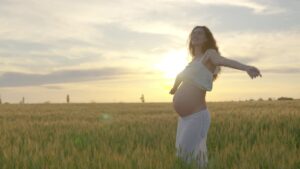Funny photo of a pregnant woman. Low angle view photo of funky funny pregnant woman.