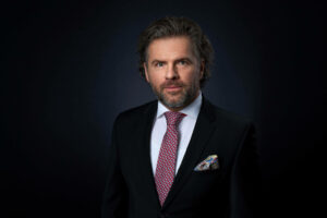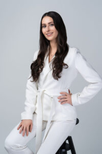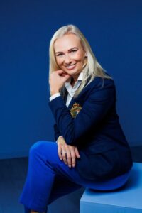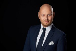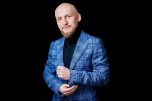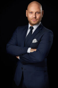 Touching and emotional first dance of the couple on their wedding with confetti and colorful lights on the background.