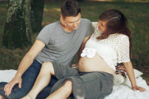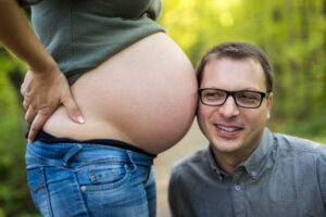 A humorous image: a pregnant woman and her husband playfully use a watermelon in place of a belly, comically highlighting the challenges of navigating with a pregnant bump.