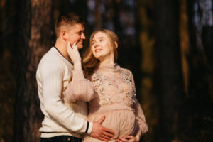 Beautiful portrait of a pregnant woman and her husband. They are standing face to face near the tree and embracing.