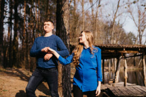 Beautiful portrait of a pregnant woman and her husband. They are walking in the forest, standing near the river, holding their hands.