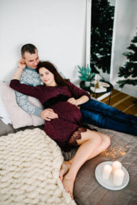Pregnant couple lying on bed near Christmas tree. Happy New Year and Merry Christmas. Christmas decorated interior. Pregnancy, family holidays, people and expectation concept.