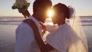 African american couple in love getting married, looking at each other on the beach at sunset. marriage, love and romance, holiday by the sea.
