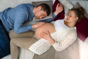 Happy young couple bonding, pregnant woman, father having fun both holding stomach at home