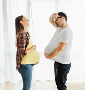 Young adult couple in love joking together. She's pregnant and and he too pretends to be pregnant.